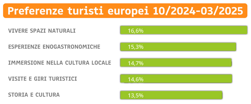 For European tourists, food and wine are a stable presence, together with nature and culture, among the most desired experiences. In the intentions of European citizens, these proposals weigh respectively 15.3% for food and wine, 16.6% for nature and 14.7% for culture (Source: European Travel Commission).